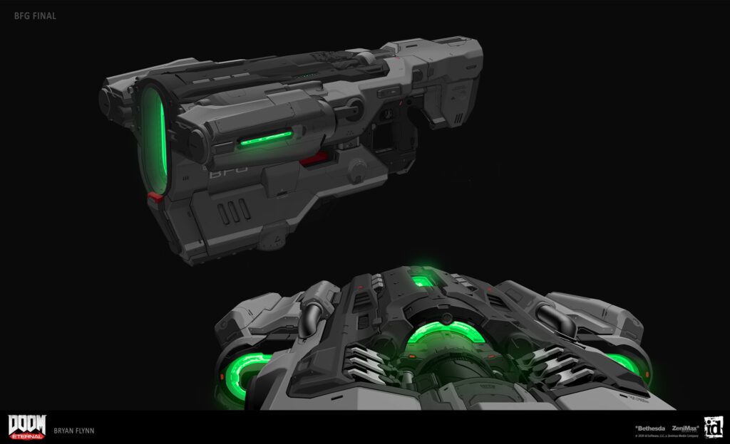 Jedna z nejznámějších střelných zbraní je určitě BFG 9000. Ruční zbraň hromadného ničení se proslavila díky herní sérii DOOM a Quake. Poprvé se objevila v první verzi hry Doom, a od té doby je její nedílnou součástí. Je to veliká ruční energetická zbraň, která vystřeluje obří koule zelené plazmy. Způsobuje velké poškození a jedná se o nejsilnější zbraň ve hře. Dokáže jediním výstřelem vyčistit celou místnost od slabších nepřátel a těm silnějším způsobovat kritická poškození.